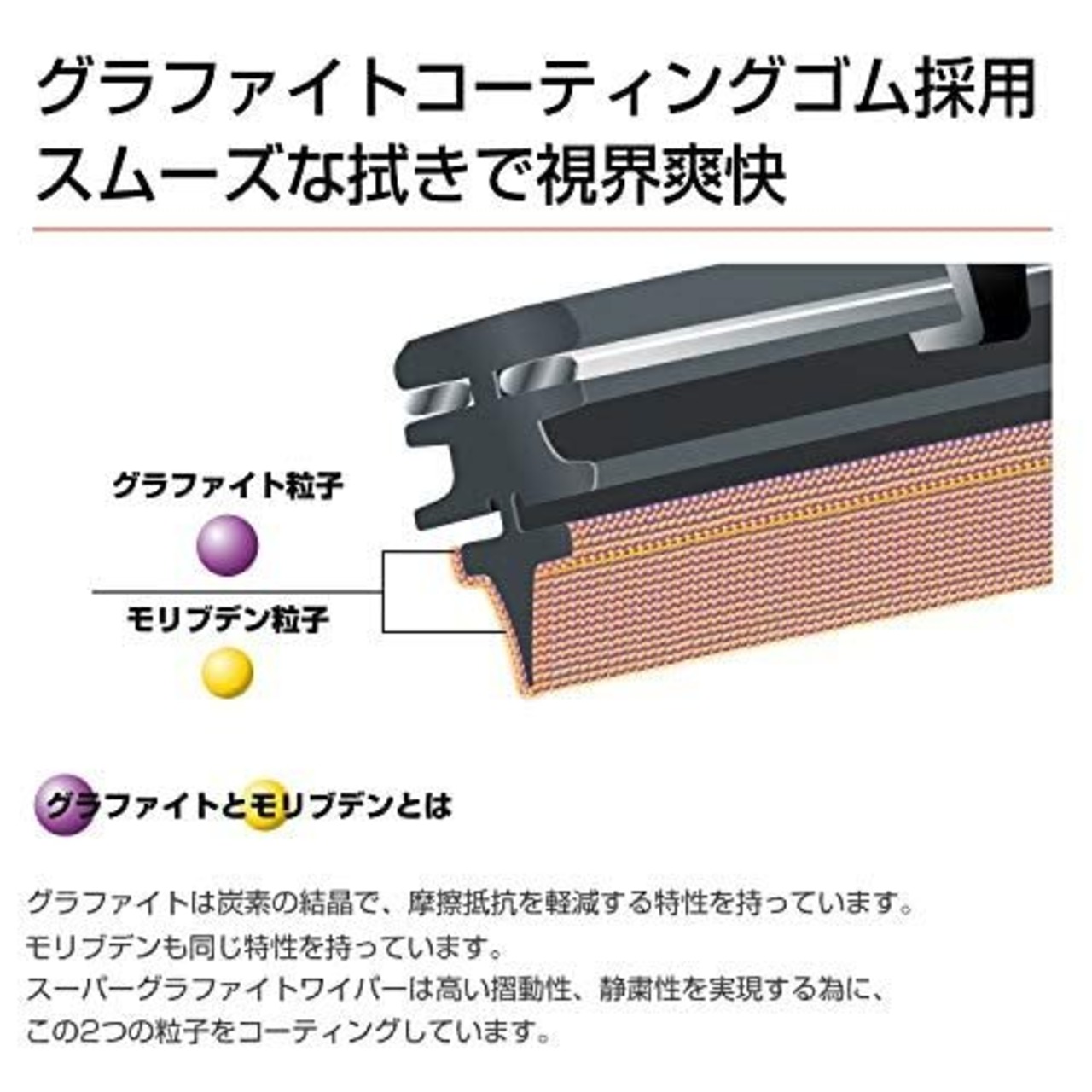 スーパーグラファイト替えゴムは、最高品質天然ゴムにグラファイト粒子、モリブデン粒子のダブルコーティングゴムを採用。2つの粒子のコーティングによりの摩擦抵抗が大幅に軽減し、不快な音、ビビリのない滑らかな動きを実現します。ウインドガラスにガラス撥水コーティングをされていても使用できます。