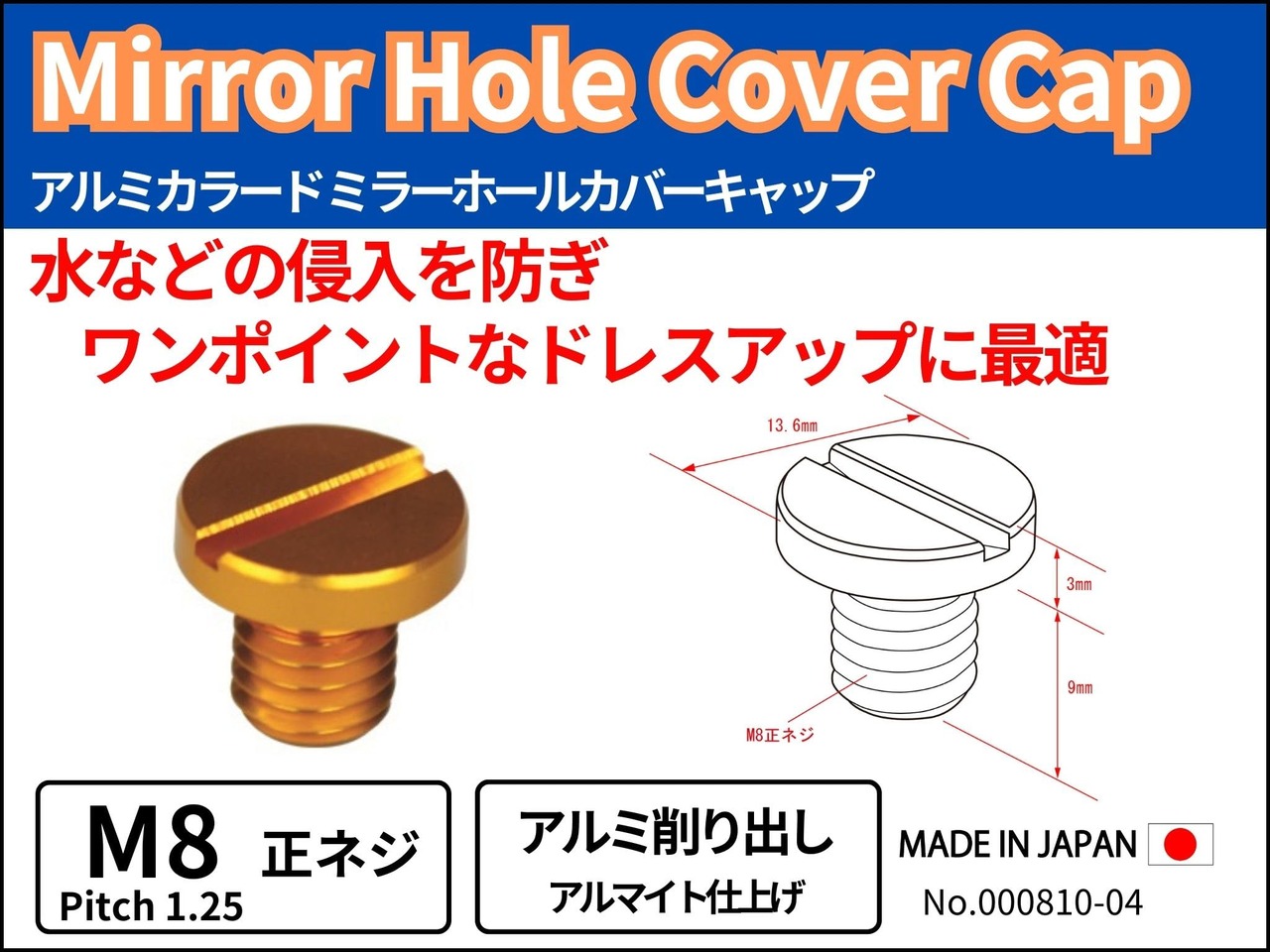 アルミ削り出しのミラー穴埋めキャップ、バーエンドミラー装着時などに使用しなくなったミラー穴を埋めるボルトです。MADE IN JAPAN ハンドル周りのクオリティを高めます。