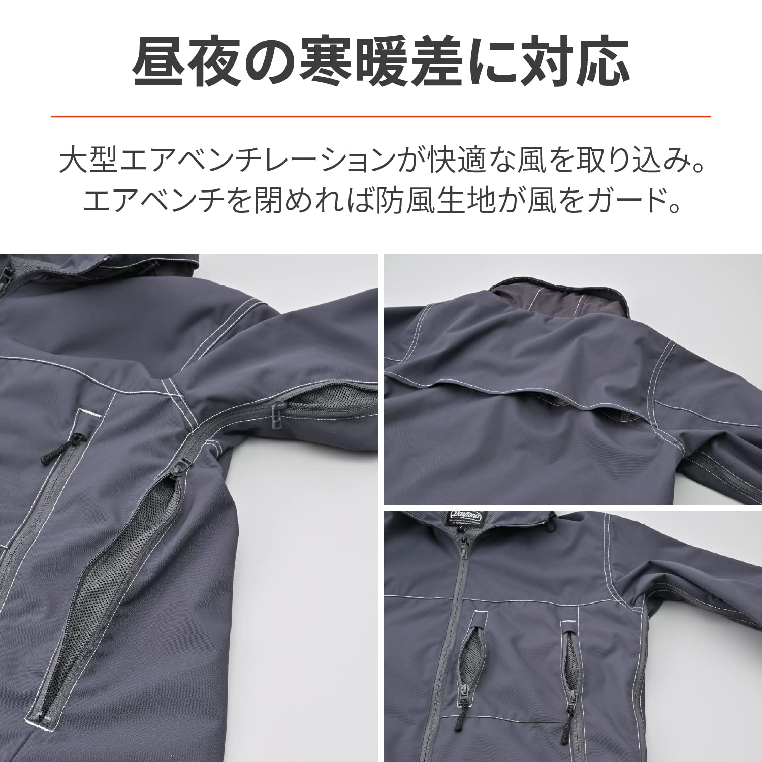 簡易防水+防風+大型エアベンチポケットにより長い季節着用可能なアウトドアパーカー風デザインのエアインテークパーカージャケット。