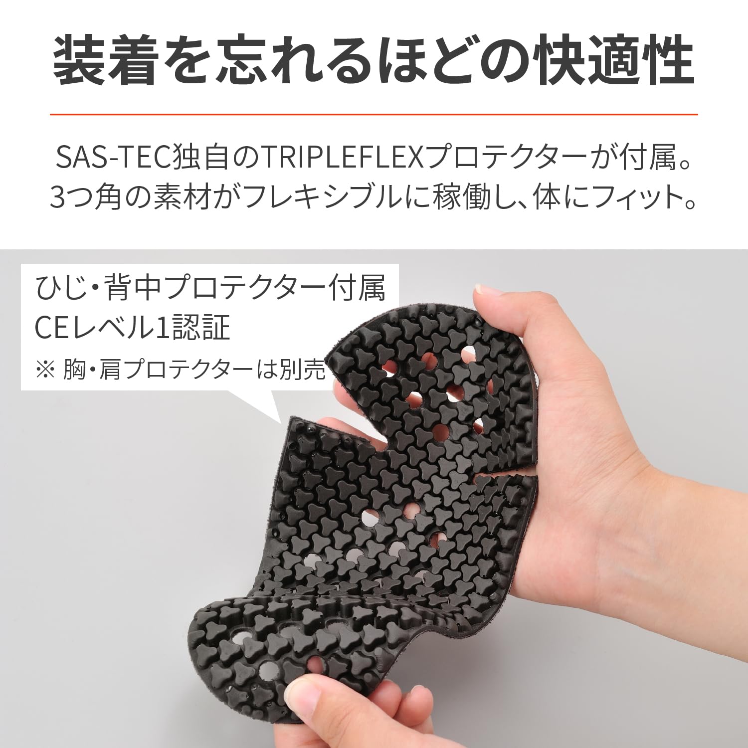 ひじ、背中のプロテクターは、SAS-TECのTRIPLEFLEXタイプを標準装備。