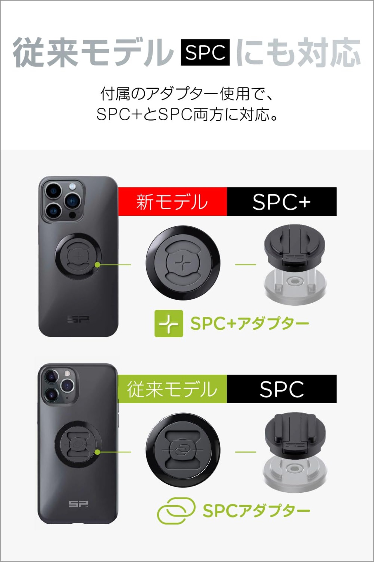 ※ 付属のSPC+変換アダプターは樹脂製のため耐震強度が不十分です。オートバイでお使いの際は、マウント側をアルミ製マウントヘッドのSP HEAD SPC+(品番:35219/35221)に交換することをおすすめします。