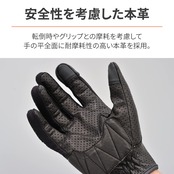 手の平に本革を採用することにより、転倒やグリップによる摩耗を防ぎ耐久性を確保しています。