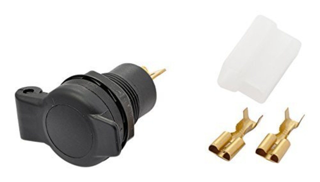 外車で使われている純正ヘラタイプシガーソケットの増設などに使用。メス側。定格:12V3A。取付穴径:φ18。