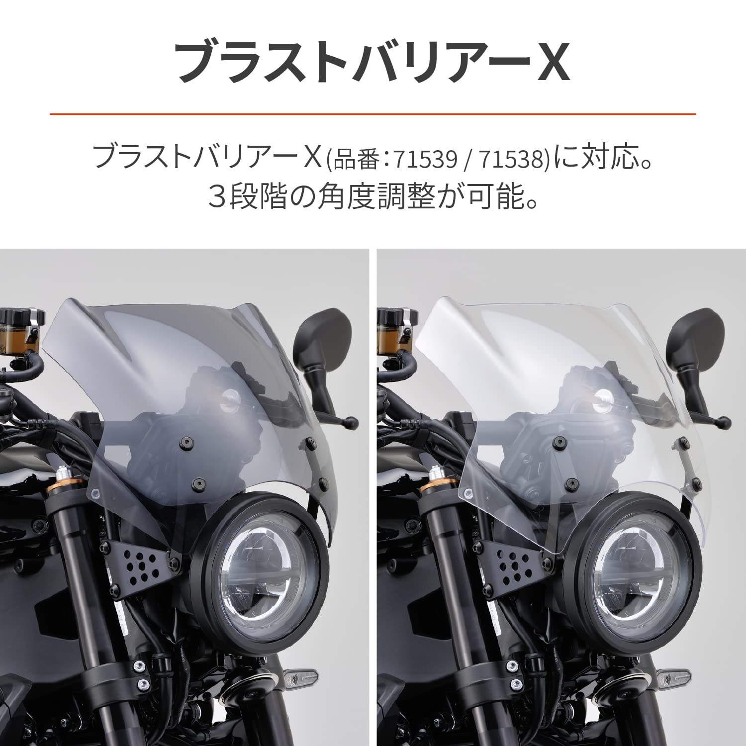 XSR900専用のバイザーステー。Aerovisor、Blast Barrier、Blast Barrier Xのスクリーン単体を組み合わせることで自分好みのスクリーンが取り付けできます。※ エアロバイザー装着時は角度調整に対応していません。※ 別売のアルミビレットハンドルとBlast Barrier/Xを同時装着する場合、寝かせたポジションではスクリーンとフロントマスターシリンダータンクが接触するため取り付けできません。