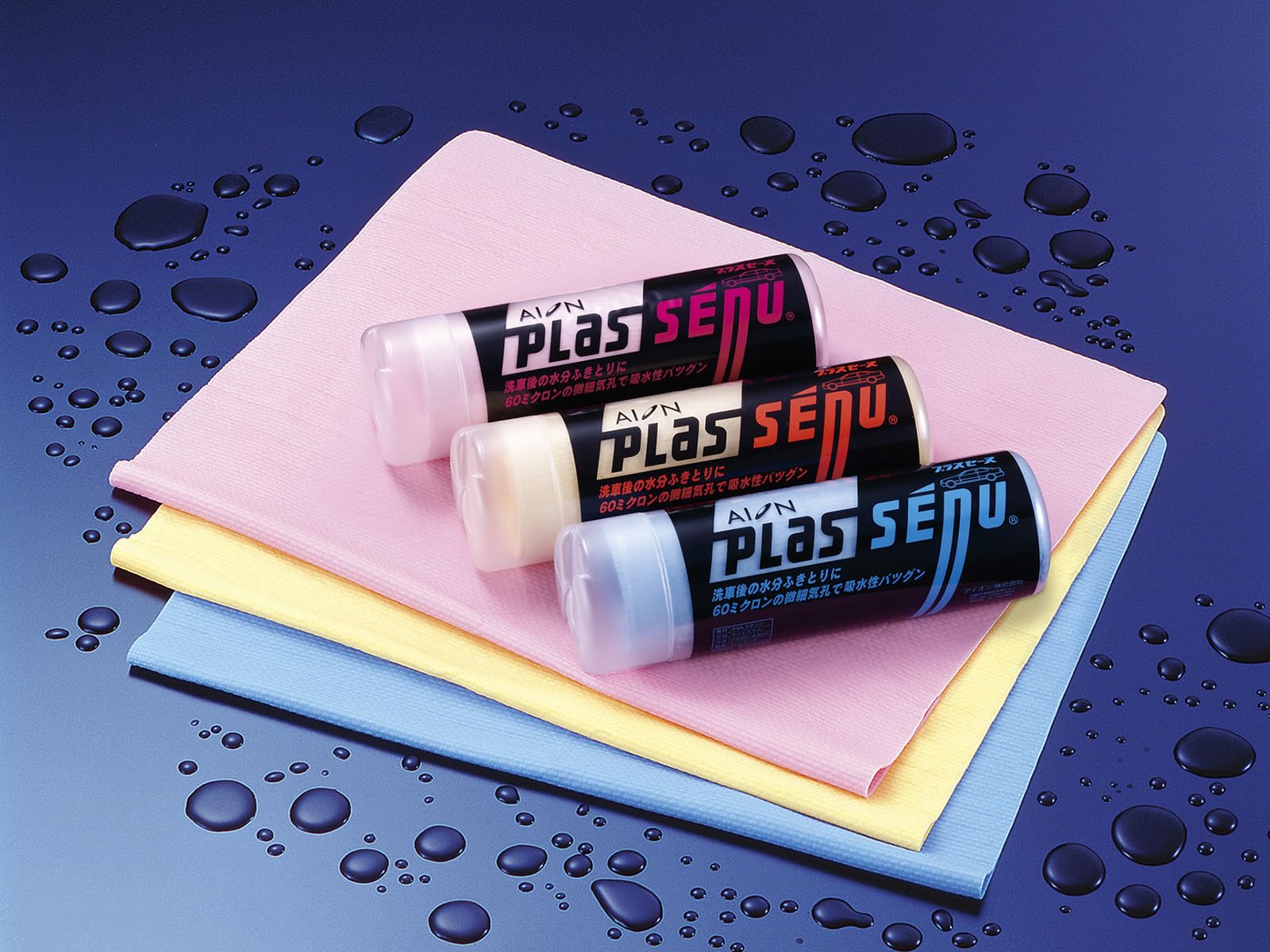 長年ご愛顧頂いている、吸水性、拭き取り性に優れた人工合成セーム。アイオン「プラスセーヌ」です。