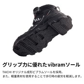 ・アドベンチャーコンセプトのデザインに基づき、悪路でのグリップに優れたTAICHIオリジナル成型ソールを採用したシューズ。
