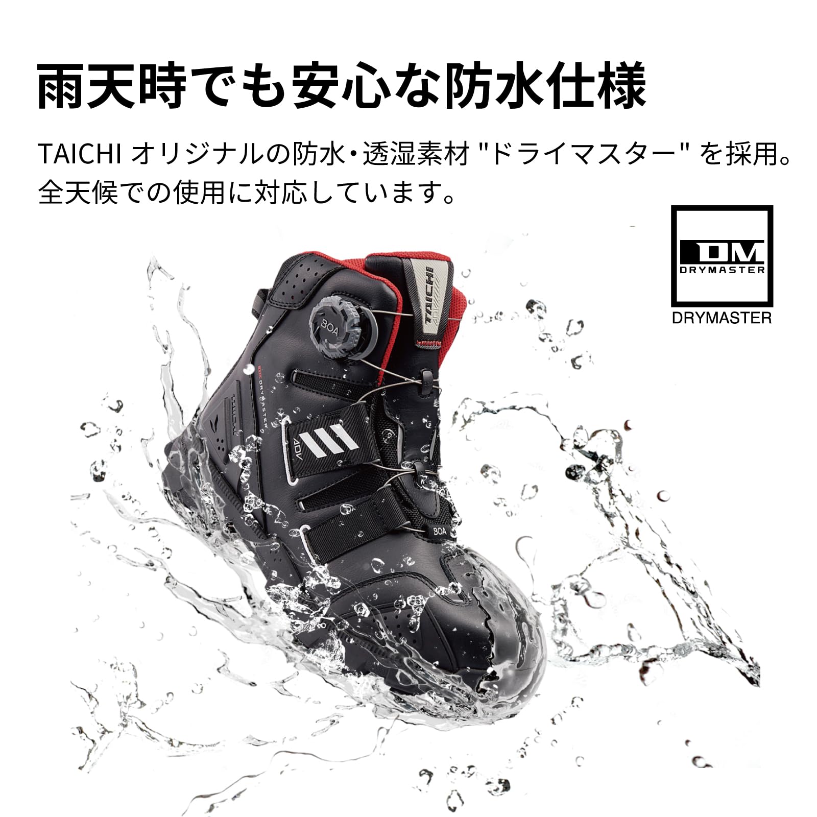 アドベンチャーコンセプトのデザインに基づき、悪路でのグリップに優れたTAICHIオリジナル成型ソールを採用したシューズ。アッパー内部にはTAICHIオリジナルの防水・透湿素材"ドライマスター"を使用し、悪天候にも快適な履き心地を実現します。アッパーのカラーに合わせてソールにも3タイプのカラーを設定。SUEDE BLACK/SUEDE BROWNには耐久性に優れ、メンテナンスも容易な人工皮革“Clarino®”を採用し、左足にはアクセサリーとして引手をつけております。また、着脱に便利なBOAダイヤルは大型のM4タイプを採用し、グローブを装着したままでもロックとリリースの操作を容易に行うことができます。