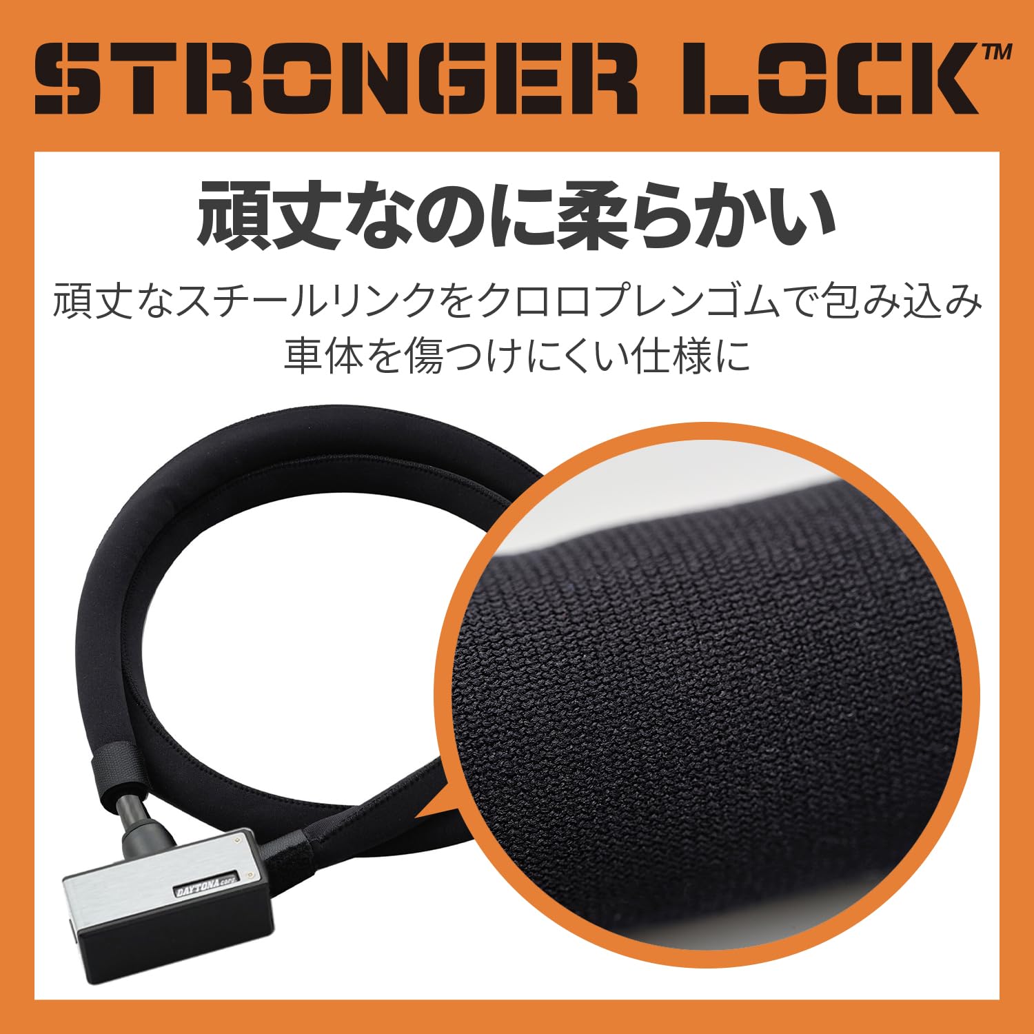 携帯するのに便利な軽量ワイヤーロック。スリーブは、車体に傷をつけにくいクロロプレンゴム製。